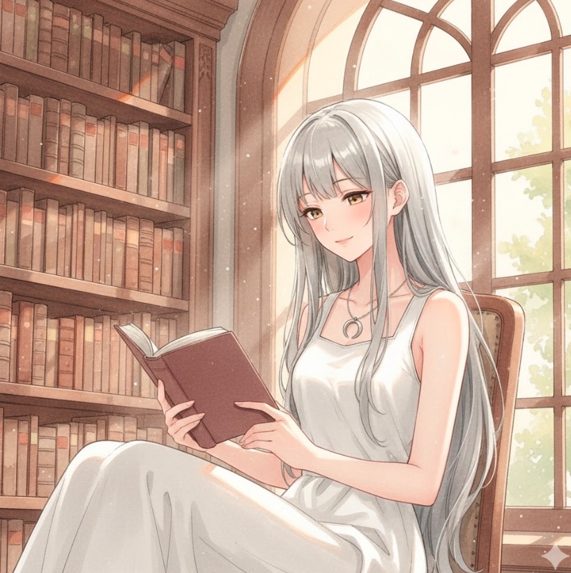 ・背景:grand library with towering bookshelves – 天井まで届く本棚がある壮大な図書館