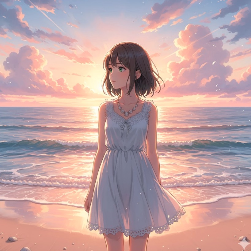 ・ポーズ:standing, looking away – 立って、視線をそらしている(海の方を見ている)