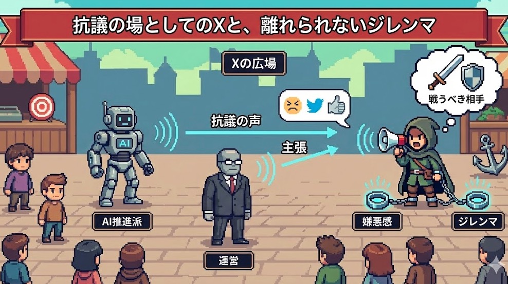 自分たちの主張を届ける相手もX上にいるため、抗議の声を上げる場として利用し続けています。嫌いな場所であっても、戦うべき相手がいる限り、そこから離れることができないというジレンマがあります。