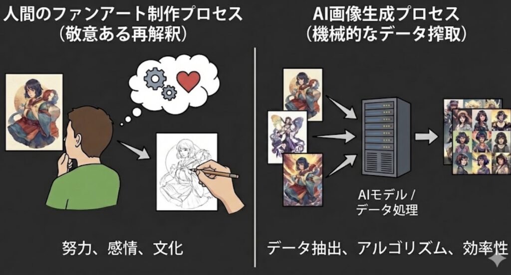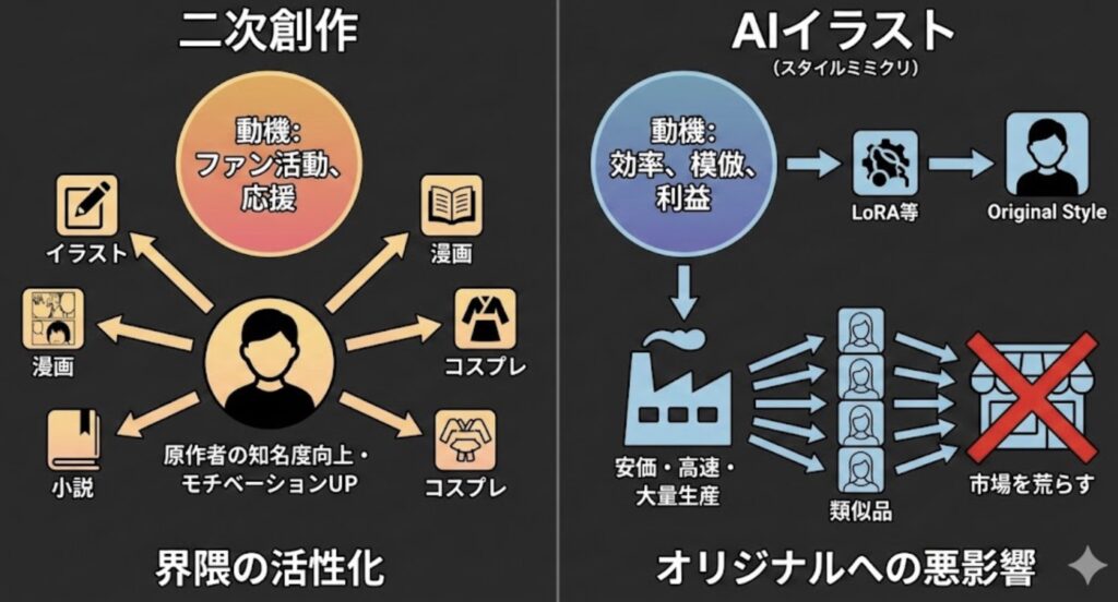二次創作は原作者へのリスペクトが前提の「共生関係」とみなされる一方、AIは先人の成果を一方的に吸い上げる「寄生(フリーライド)」と捉えられています。