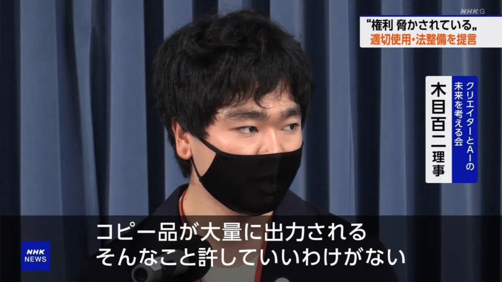 2023年4月、NHKのニュース番組に「木目百二」という名前の人物が登場しました。彼は「クリエイターとAIの未来を考える会」の代表として、AIがクリエイターの作品を勝手に学習するのは泥棒だと強く訴えました。